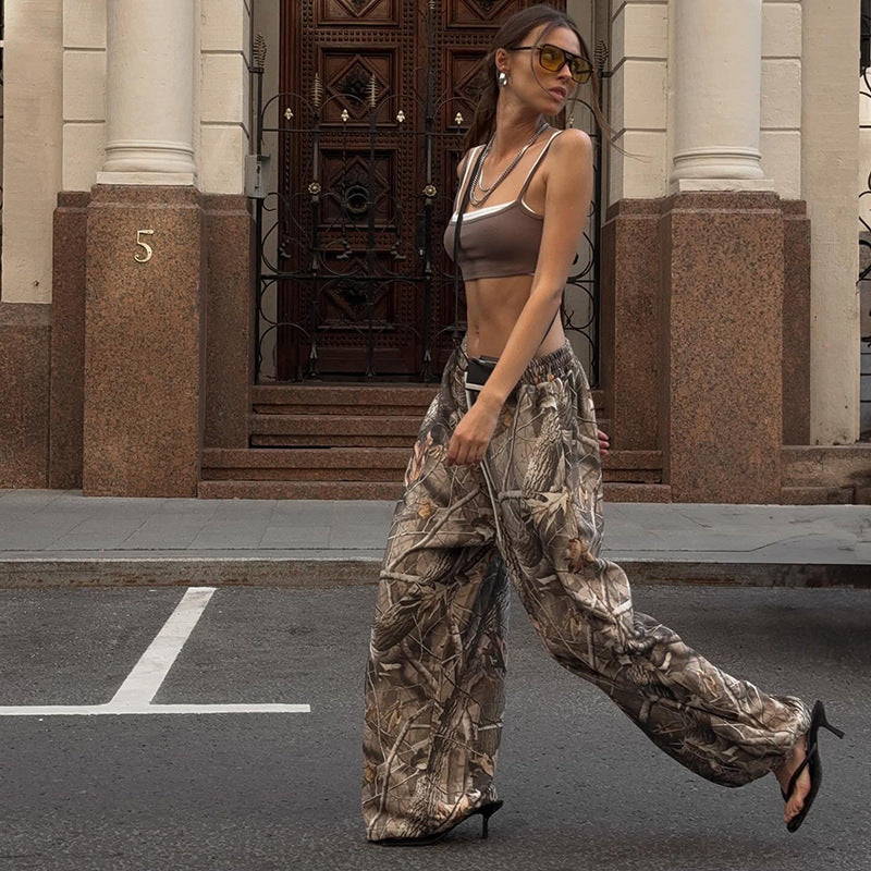 Pantalons élastiques à taille basse avec cordon de serrage, imprimé rétro à branches